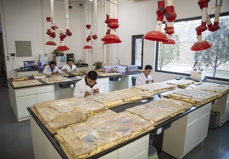 云岡研究院壁畫修復(fù)師正在進(jìn)行修復(fù)工作。人民網(wǎng)記者 王帆攝