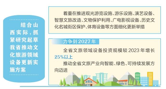 系統(tǒng)推進(jìn),夯實(shí)重點(diǎn)任務(wù)。結(jié)合山西實(shí)際,抓緊研究起草我省推動文化旅游領(lǐng)域設(shè)備更新實(shí)施方案,著重在推進(jìn)觀光游覽設(shè)施、游樂設(shè)施、演藝設(shè)備、智慧文旅改造、文物保護(hù)利用、廣電影視設(shè)備、歷史文化名城街區(qū)保護(hù)、體育設(shè)備等方面細(xì)化更新舉措,明確更新提升重點(diǎn),力爭到2027年,全省文旅領(lǐng)域設(shè)備投資規(guī)模較2023年增長25%以上,推動全省文旅產(chǎn)業(yè)向智能、綠色、可持續(xù)發(fā)展方向邁進(jìn)。