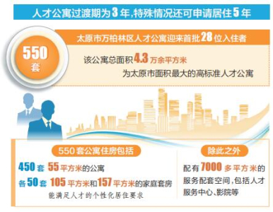 太原市高度重視人才工作,大力實(shí)施人才強(qiáng)市戰(zhàn)略,不斷創(chuàng)新人才政策,優(yōu)化人才生態(tài),為各類人才提供廣闊的發(fā)展舞臺。作為太原市的核心城區(qū),萬柏林區(qū)搶抓打造人才高地的重大機(jī)遇,精心建設(shè)拎包入住、設(shè)施齊全、服務(wù)優(yōu)質(zhì)的高品質(zhì)人才公寓。550套公寓住房包括450套55平方米的公寓、105平方米和157平方米的家庭套房各50套,能滿足人才的個性化居住要求。除此之外,還配有7000多平方米的服務(wù)配套空間,包括人才服務(wù)中心、影院、餐廳、書吧、健身房、創(chuàng)客空間等。