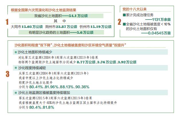 荒漠化是影響人類生存和發(fā)展的全球性重大生態(tài)問題。我省晉西北和晉北地區(qū)是全國荒漠化監(jiān)測與防治的重點地區(qū)之一。經(jīng)過長期積極探索,不斷創(chuàng)新機制和科學防沙治沙,我省實現(xiàn)了沙化面積和程度“雙下降”、沙化土地植被蓋度和沙區(qū)環(huán)境空氣質(zhì)量“雙提升”的實際成效。