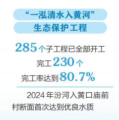 碧水保衛(wèi)戰(zhàn)鞏固提升。深入開展黃河干流流經縣生態(tài)環(huán)境綜合治理攻堅行動,全面完成黃河流域入河排污口排查整治,全省3915個入河排污口納入平臺監(jiān)管。嚴格落實“四水四定”,建立全省管控指標體系,強化水資源消耗總量和強度剛性約束,實施深度節(jié)水控水行動,萬元工業(yè)增加值用水量較“十三五”末下降30.0%。開展地下水超采綜合治理,全省地下水位整體回升2.51米,持續(xù)推進全省19處巖溶大泉保護治理,斷流30年的晉祠泉2023年實現(xiàn)復流。全省地表水國考斷面優(yōu)良水體比例由“十三五”末的70.7%提升至2024年的94.7%,連續(xù)兩年超過國家平均水平,黃河干流(山西段)水質連續(xù)三年穩(wěn)定達到Ⅱ類,汾河入黃口斷面2024年首次達Ⅲ類優(yōu)良。