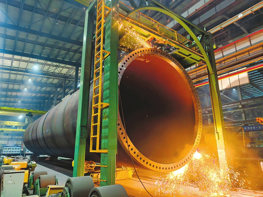 1月19日,在省級裝配式建筑產(chǎn)業(yè)鏈“鏈核”企業(yè)山西鋼構(gòu)科工有限公司智能制造車間內(nèi),一臺巨型壓力容器正進行焊接作業(yè)。輥道與龍門架穩(wěn)穩(wěn)托舉著數(shù)十米長的鋼構(gòu)件,自動化系統(tǒng)實時監(jiān)測焊縫質(zhì)量,全力保障昔陽、陽曲、廣靈、屯留等地風(fēng)電項目塔筒制作。 賈曉瑞 王宇攝