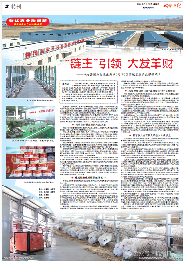 作為神池現(xiàn)代農(nóng)業(yè)產(chǎn)業(yè)示范區(qū)“鏈主”企業(yè),天牧生物已構(gòu)建起一條集種羊繁育、生態(tài)養(yǎng)殖、精細(xì)屠宰、精深加工、中央廚房、冷鏈物流、銷售平臺、綠色餐廳于一體的全“羊”完整產(chǎn)業(yè)鏈。目前,公司擁有2座現(xiàn)代化種羊場、6座萬只生態(tài)肉羊養(yǎng)殖基地、1條年屠宰15萬只羊生產(chǎn)線、1條年精深加工3000噸肉羊生產(chǎn)線以及1座現(xiàn)代化中央廚房,有效促進(jìn)了縣域肉羊全產(chǎn)業(yè)鏈發(fā)展。