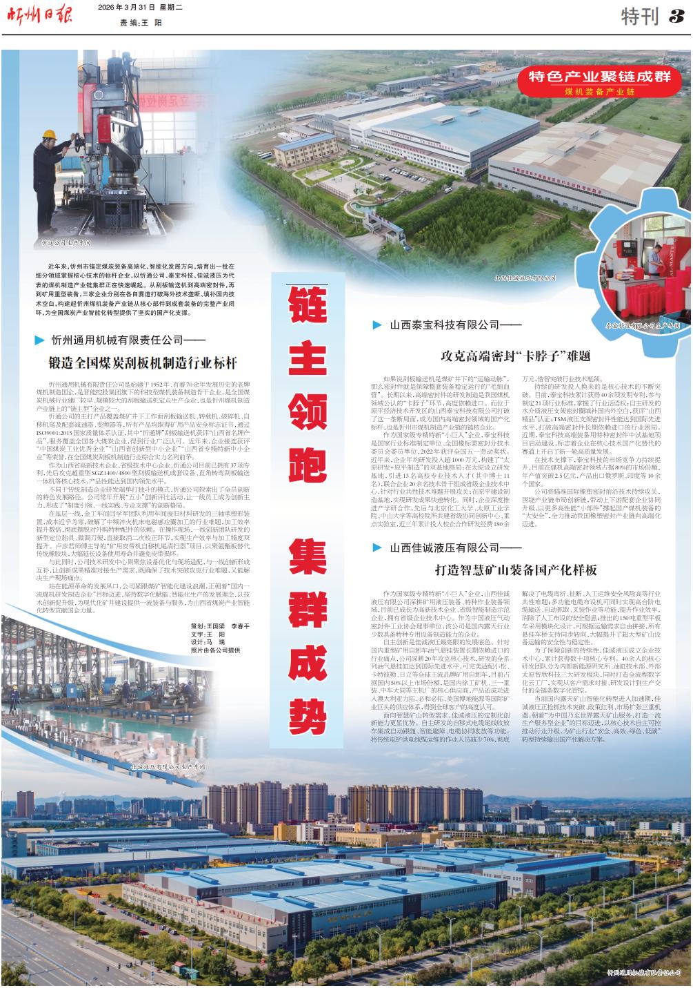 近年來,忻州市錨定煤炭裝備高端化、智能化發(fā)展方向,培育出一批在細分領域掌握核心技術的標桿企業(yè),以忻通公司、泰寶科技、佳誠液壓為代表的煤機制造產(chǎn)業(yè)鏈集群正在快速崛起。從刮板輸送機到高端密封件,再到礦用重型裝備,三家企業(yè)分別在各自賽道打破海外技術壟斷、填補國內技術空白,構建起忻州煤機裝備產(chǎn)業(yè)鏈從核心部件到成套裝備的完整產(chǎn)業(yè)閉環(huán),為全國煤炭產(chǎn)業(yè)智能化轉型提供了堅實的國產(chǎn)化支撐。
