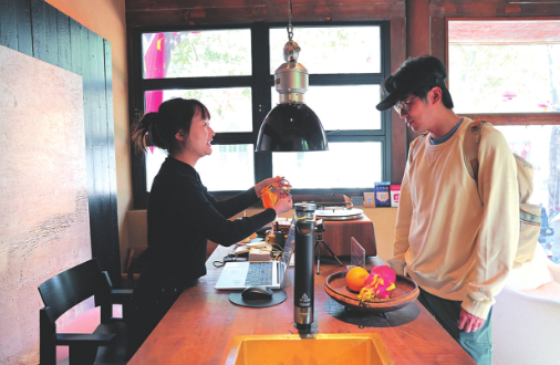 在忻州古城“聽(tīng)初”民宿,店長(zhǎng)朵朵正在為住客辦理入住業(yè)務(wù)。 暢 雪 張 媛攝