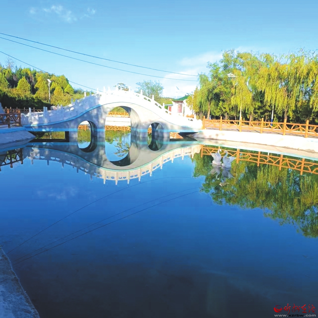 沿路而下,過(guò)橋爬坡,便到了天鵝湖。誰(shuí)能想到,這碧水涵虛的景致,原是當(dāng)年造林蓄水的大水坑?工程完工后順勢(shì)修整,竟成飛龍山又一勝景。天鵝湖呈葫蘆狀,漢白玉拱橋橫跨腰間如玉帶,橋東石雕飛龍昂首欲飛,橋西石雕雙鵝戲水憨萌。湖水清澈見底,倒映藍(lán)天白云綠樹,風(fēng)過(guò)時(shí)漣漪擴(kuò)散,美得讓人心醉,連時(shí)間都慢了下來(lái)。
