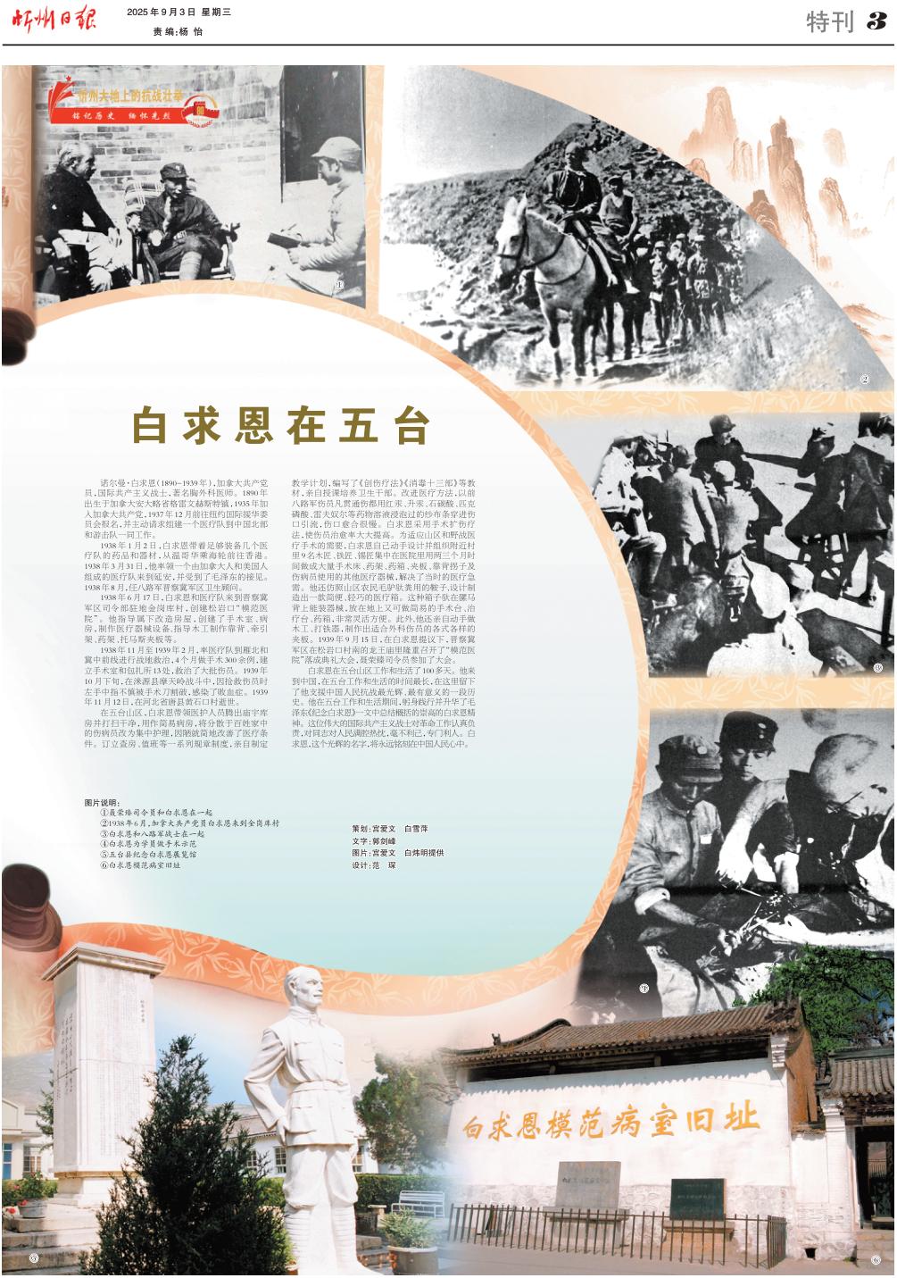 白求恩在五臺山區(qū)工作和生活了100多天。他來到中國,在五臺工作和生活的時間最長,在這里留下了他支援中國人民抗戰(zhàn)最光輝、最有意義的一段歷史。他在五臺工作和生活期間,躬身踐行并升華了毛澤東《紀念白求恩》一文中總結概括的崇高的白求恩精神。這位偉大的國際共產(chǎn)主義戰(zhàn)士對革命工作認真負責,對同志對人民滿腔熱忱,毫不利己,專門利人。白求恩,這個光輝的名字,將永遠銘刻在中國人民心中。