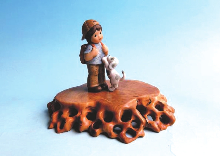 我的藏品中有一件來自德國的喜姆瓷偶·上學,它是赴德工作的同事帶回的禮物。這件瓷偶高8.5厘米、長5.5厘米、寬2.8厘米,生動刻畫了一個背著雙肩包即將去學校的小男孩和一只不舍小主人離開的花狗,溫馨逗趣的畫面讓人忍俊不禁。