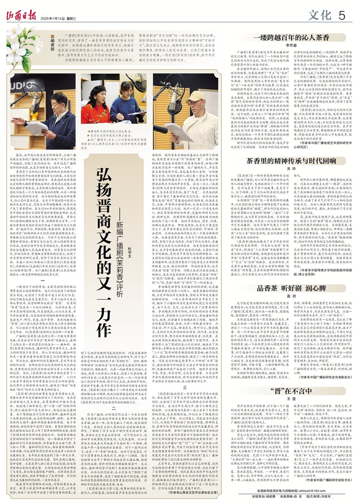 廣播劇《茉莉香》以聲傳情,以茶載道,在聲音構(gòu)筑的時空里,演繹了一曲百年晉商的誠信傳承與時代新聲。該劇通過謙和祥茶莊的百年變遷,細(xì)膩勾連民國與現(xiàn)代兩代茶人的命運,在技藝的堅守與革新中,探尋晉商文化生生不息的內(nèi)在脈動。