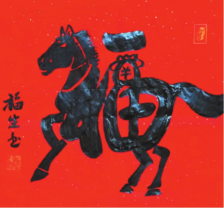 生肖文化,是中華民俗之根脈,王福生緊扣福字主題,應(yīng)時而作,應(yīng)物而書,將十二生肖意象與福字完美融合,創(chuàng)作出獨具氣象的“生肖?!毕盗?,合于《道德經(jīng)》“動善時”的智慧——順天時,合地利,應(yīng)人心,與時俱化。其馬年“馬上福”堪稱福字神品:以草書筆勢,將“?!迸c“馬”渾然合一,“礻”為駿馬昂首,鬃毛飛揚;“畐”為身軀矯健,奮蹄向前;“田”化為鞍飾,點睛傳神。整幅福作一氣呵成,筆走龍蛇,靈動奔放,卻又穩(wěn)而不飄,勁而不躁,正是老子“知其雄,守其雌”的筆墨體現(xiàn)。