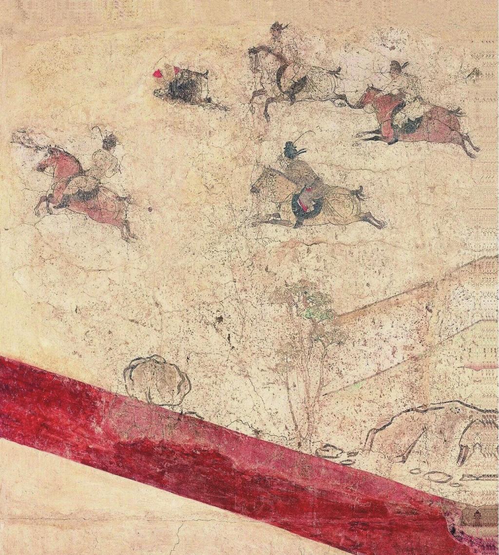 初唐淮安王李壽墓墓道東壁的《備馬出行圖》中,42匹青、灰、白、紅、褐各色交織的駿馬昂首闊步,馬上騎士手持紅旗,相互顧盼,一派王公貴胄儀仗出行的煊赫氣象;盛唐章懷太子李賢墓道西壁的《馬球圖》,20余騎馳騁如風,青山古樹為幕,馬蹄翻飛間盡顯“神駿追風”的活力……這些定格在墻壁上的身影,不僅是唐代繪畫藝術的瑰寶,更是一扇窺見唐人生活脈搏的窗口。