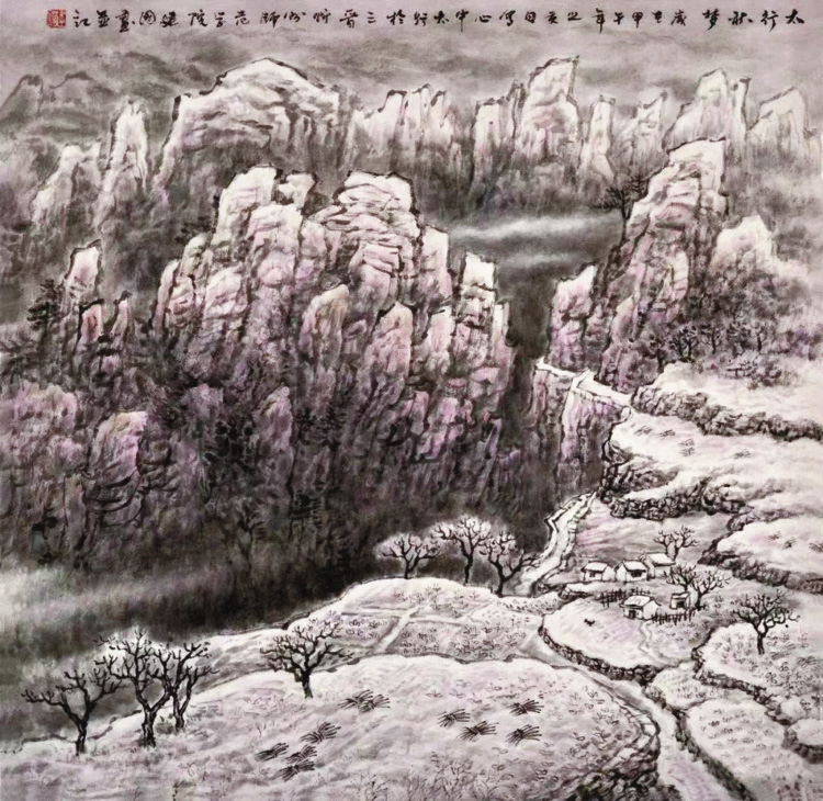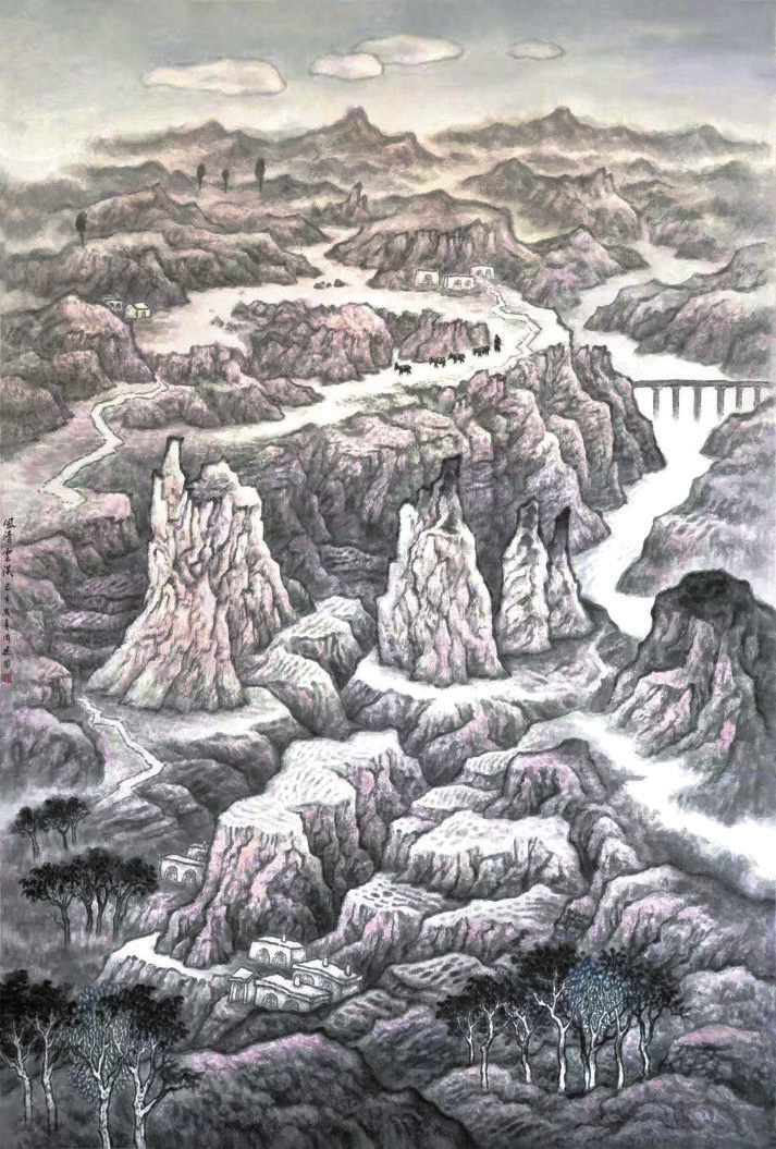 周建國對中國山水畫有著獨(dú)特見解,出版過畫集《中國美術(shù)名家精品鑒賞·周建國作品集》。他的創(chuàng)作之路主要分為兩個時(shí)期,前期追求中西融合,后期則回歸傳統(tǒng)。前期作品《曉月》《古原除夕》《月色》等,多取材于黃土高原,真切流露出其對黃土地的深情厚愛:早上飄起的炊煙演繹著百姓的勤勞,喧鬧的腰鼓彰顯著鄉(xiāng)民熱愛生活的豪情,晨起上課的學(xué)生更是承載著當(dāng)?shù)厝藵M滿的希望。周建國將黃土地上的一草一木皆升華為獨(dú)特且富有個性的生命體,畫面處理側(cè)重將西方油畫的光影巧妙融入作品,寓動于靜,動靜相宜,彰顯“高貴的單純,靜穆的偉大”的內(nèi)在張力。同時(shí)將傳統(tǒng)山水繪畫的造型、空間結(jié)構(gòu)、筆法設(shè)色皆進(jìn)行改變——黃土溝壑的幾何化處理、筆墨色調(diào)的反復(fù)拿捏、耐人尋味的空間布局,都體現(xiàn)了其特殊的創(chuàng)作理念。相較前期,周建國后期的作品更加注重對內(nèi)在美的挖掘,如《風(fēng)月同天》《家園》《和諧家園》《生息之地》《太行月色》等代表作品,表達(dá)對祖國山河大川的熱愛,走“外師造化,中得心源”之道,畫風(fēng)趨向率真,試圖突破中國山水繪畫的表象審美,追尋深層意義的表達(dá)。