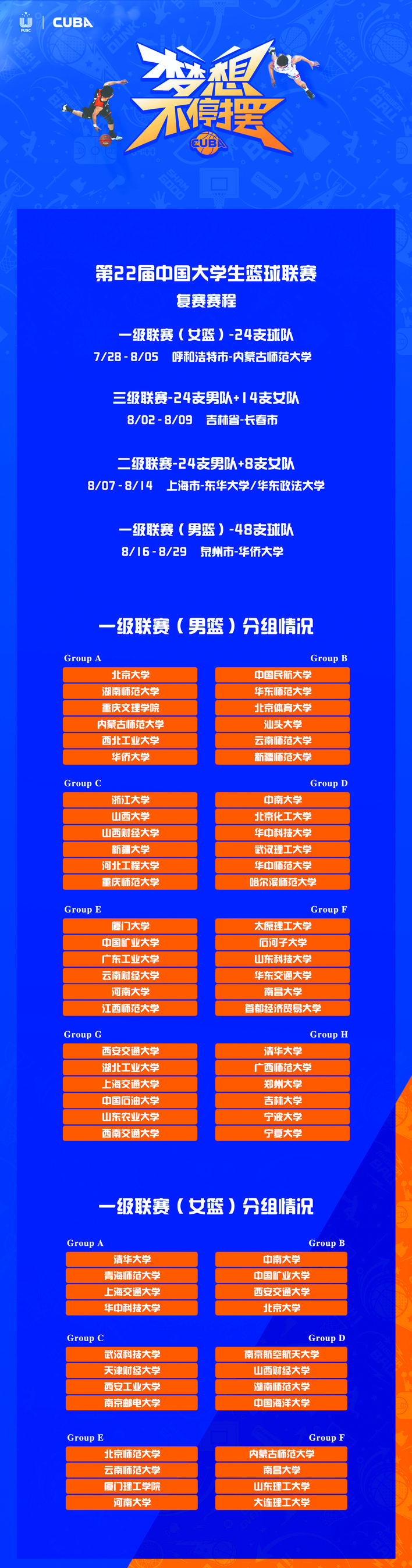 新華社北京7月14日電(記者李博聞、王鏡宇)7月28日起,第22屆CUBA(中國(guó)大學(xué)生籃球聯(lián)賽)剩余比賽將以賽會(huì)制形式分別在內(nèi)蒙古師范大學(xué)、東華大學(xué)、華東政法大學(xué)、華僑大學(xué)和吉林省長(zhǎng)春市等地空?qǐng)鲞M(jìn)行。CUBA聯(lián)賽組委會(huì)對(duì)復(fù)賽后的賽程進(jìn)行了精簡(jiǎn)。
