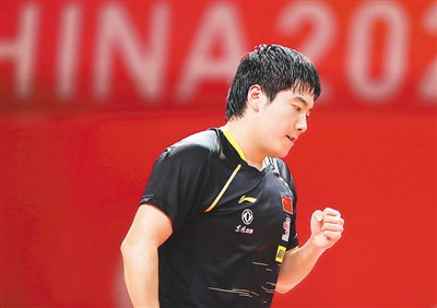 8月14日,梁靖崑在比賽中慶祝得分。當(dāng)日,在海南陵水舉行的中國(guó)乒乓球隊(duì)奧運(yùn)模擬賽男子單打決賽中,梁靖崑以4比2戰(zhàn)勝王楚欽,獲得冠軍。