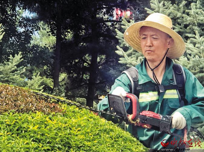 城市是我家,我來扮美它。市園林服務(wù)中心體育廣場(chǎng)管理辦公室張立文正在精心修剪綠植。本報(bào)記者 范 濤 攝