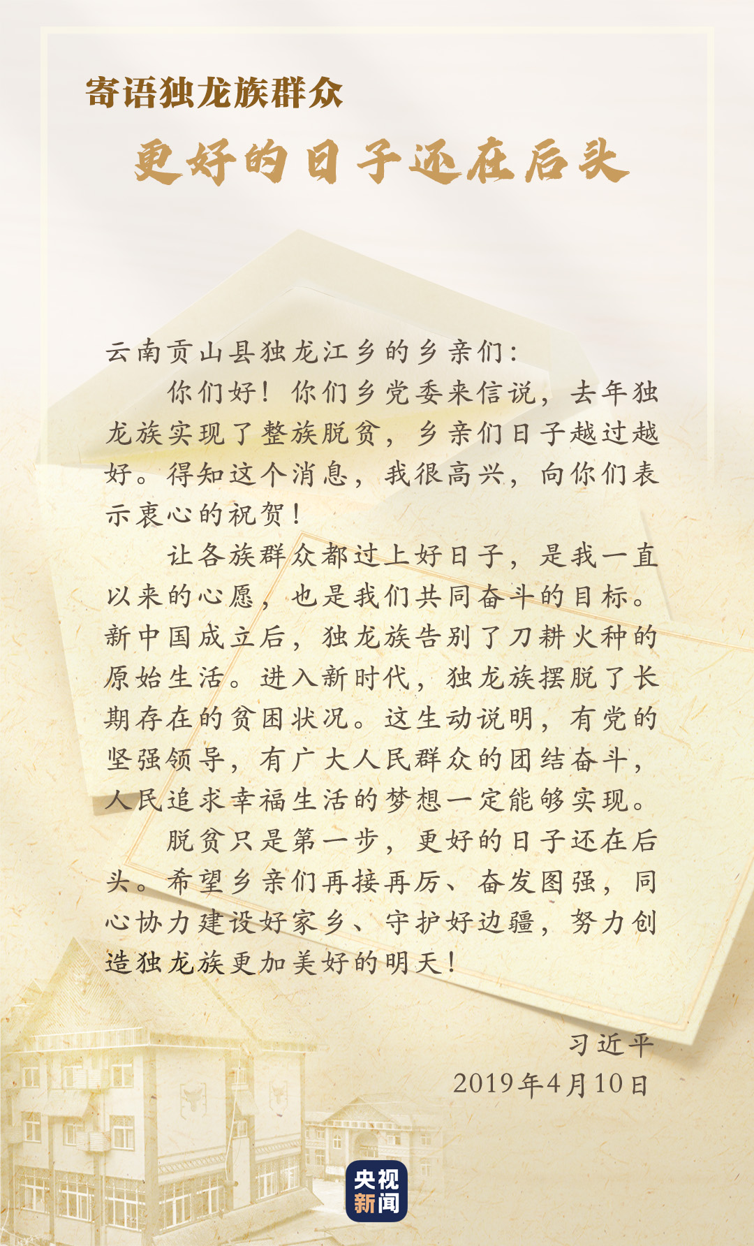 深居祖國(guó)西南邊陲的獨(dú)龍族同胞,一直是習(xí)近平總書記的牽掛。 2014年元旦前夕,貢山縣干部群眾就給習(xí)近平總書記寫信,報(bào)告多年期盼的高黎貢山獨(dú)龍江公路隧道即將貫通的喜訊??倳浐芸旖o他們回了信,希望他們“加快脫貧致富步伐,早日實(shí)現(xiàn)與全國(guó)其他兄弟民族一道過(guò)上小康生活的美好夢(mèng)想”。 總書記的深切關(guān)懷激勵(lì)著獨(dú)龍族干部群眾在全面脫貧、全面建成小康社會(huì)的道路上奮力前行。