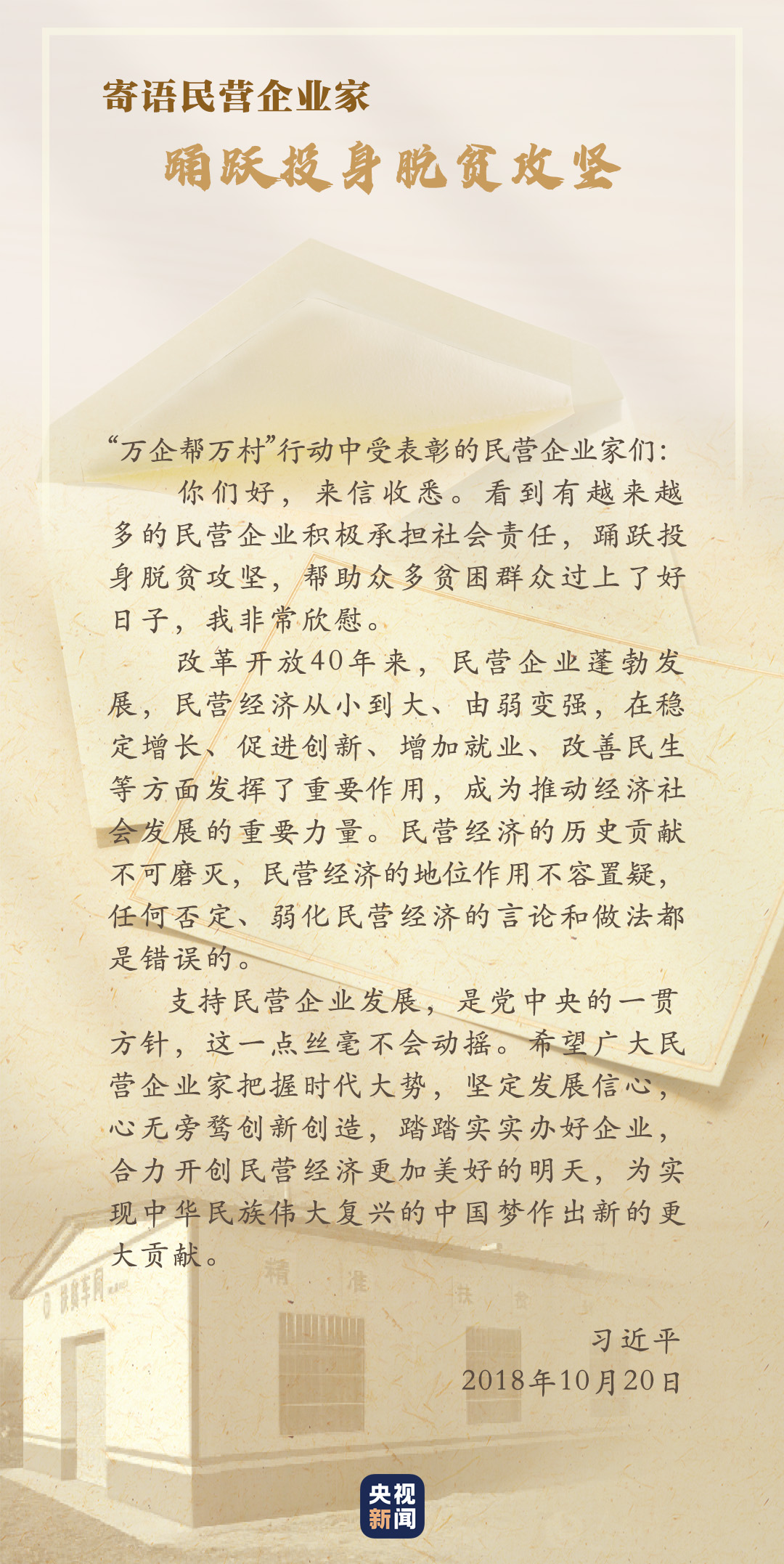 習(xí)近平對(duì)民營(yíng)企業(yè)高度重視,給“萬(wàn)企幫萬(wàn)村”行動(dòng)中受表彰的民營(yíng)企業(yè)家回信,對(duì)他們踴躍投身脫貧攻堅(jiān)予以肯定,勉勵(lì)廣大民營(yíng)企業(yè)家堅(jiān)定發(fā)展信心,踏踏實(shí)實(shí)辦好企業(yè)。 在寧夏永寧縣閩寧鎮(zhèn),一批批福建民營(yíng)企業(yè)家投身脫貧幫扶工作,在寧夏積極建廠,支持當(dāng)?shù)亟?jīng)濟(jì)發(fā)展,解決當(dāng)?shù)匕傩站蜆I(yè)。截至2019年底,已有5700家福建籍企業(yè)、商戶入駐寧夏。
