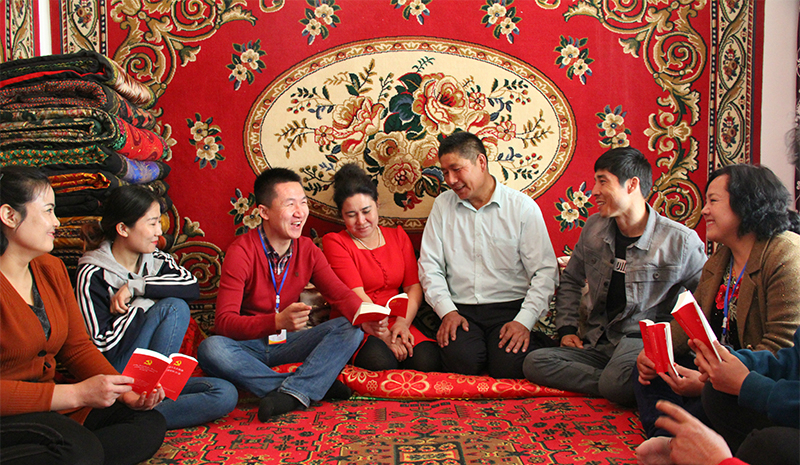 △達(dá)西村村民在聆聽(tīng)駐村工作隊(duì)隊(duì)員宣講黨的好政策。 “口袋里要鼓囊囊,精神上要亮堂堂”。2014年4月,習(xí)近平在新疆考察時(shí)講到了達(dá)西村的村訓(xùn)。村民們懷著激動(dòng)的心情給總書記寫信,匯報(bào)這些年村里的積極變化。當(dāng)年9月,習(xí)近平總書記給沙吾爾·芒力克和全體村民回信,強(qiáng)調(diào)興疆穩(wěn)疆,重在基層。 如今,達(dá)西村是3A級(jí)景區(qū)。以達(dá)西展覽館為龍頭,風(fēng)情街、馕產(chǎn)業(yè)街、夜市、風(fēng)情園、香梨園……串聯(lián)起達(dá)西村鄉(xiāng)村旅游格局。