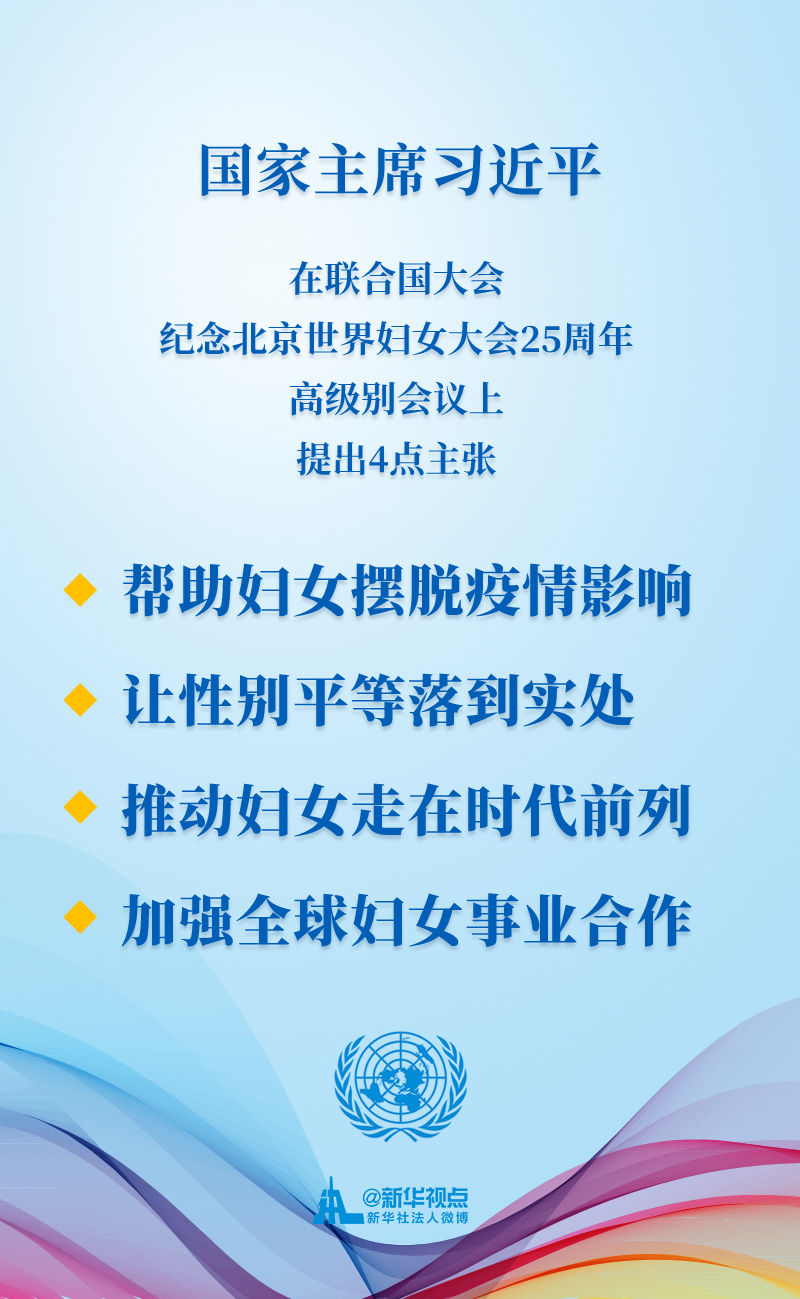 10月1日,聯(lián)合國大會(huì)紀(jì)念北京世界婦女大會(huì)25周年高級別會(huì)議舉行,習(xí)近平主席出席會(huì)議并發(fā)表講話。