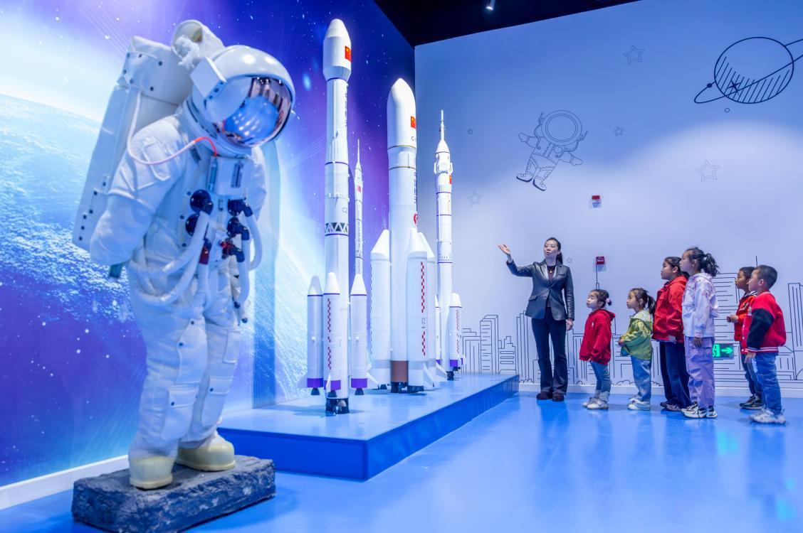 △2026年4月23日,甘肅張掖,孩子們在科技館航天科普展廳近距離參觀長征系列火箭模型。