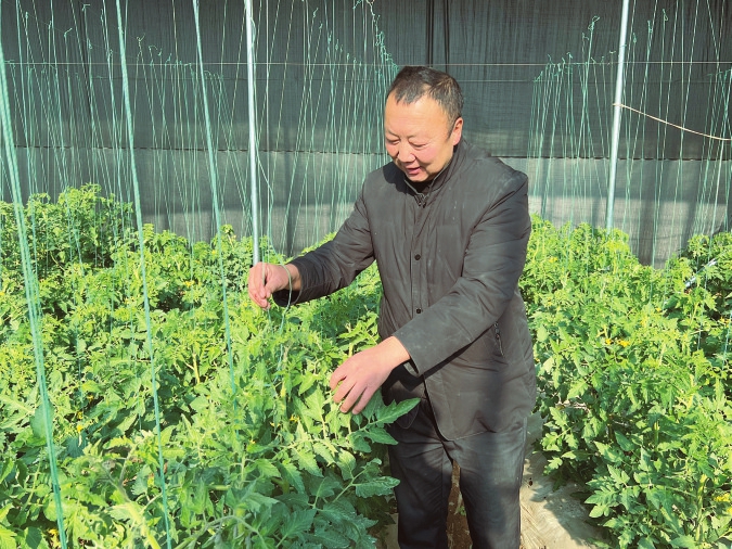 陽(yáng)高縣迎春蔬菜種植專業(yè)合作社負(fù)責(zé)人王學(xué)斌在育苗示范基地查看小番茄苗長(zhǎng)勢(shì)。 本報(bào)通訊員攝
