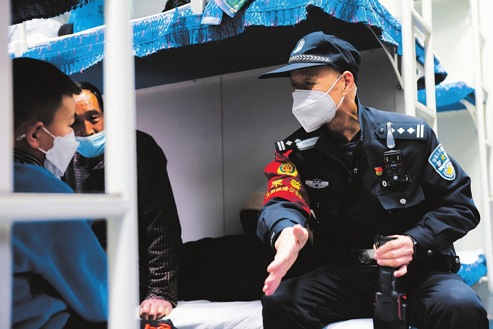 6時20分,列車緩緩駛出,老屈開始對整列車廂進行巡視,在8號車廂,看見有人將羽絨衣掛在衣帽鉤上,老屈現(xiàn)場演示了小偷用自己衣服做遮擋和掩護盜竊的作案伎倆,并叮囑大家看管好自己隨身攜帶的物品,以免丟失?!氨U下每偷陌踩?,是乘警的天職,在車上,我們要不斷地對重點部位進行檢查,對旅客進行安全宣傳,尤其是到了春運時候,我更得做好本職工作,讓每一個乘車旅客平安回家。”屈保良說道。