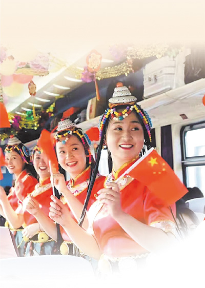 西寧開往拉薩的列車上,乘務(wù)人員與旅客聯(lián)歡。資料照片