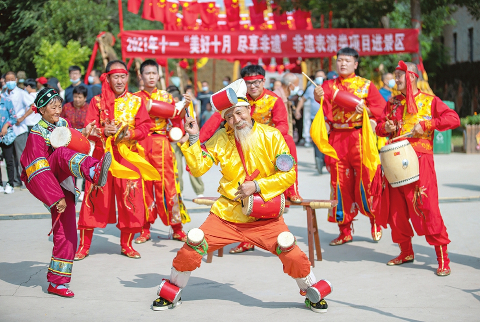 10月2日,民間藝人在鹽湖區(qū)東郭鎮(zhèn)嵐山根景區(qū)表演國(guó)家級(jí)非遺“萬(wàn)榮花鼓”。國(guó)慶長(zhǎng)假期間,運(yùn)城市鹽湖區(qū)東郭鎮(zhèn)嵐山根景區(qū)在做好疫情防控的同時(shí),推出“非遺進(jìn)景區(qū)”、蒲劇展演等豐富多彩的民俗活動(dòng),吸引了眾多游客前來(lái)游玩。(閆鑫攝)