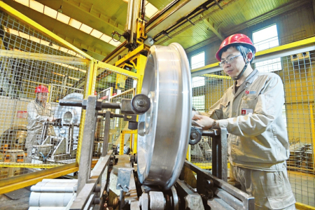 俯瞰窗外,流水線上一片片锃光瓦亮的車輪正快速產(chǎn)出,等待裝車發(fā)貨??刂剖依?,參觀者依然興趣盎然,仔細(xì)傾聽著、品味著“太重制造”自主創(chuàng)新的故事……