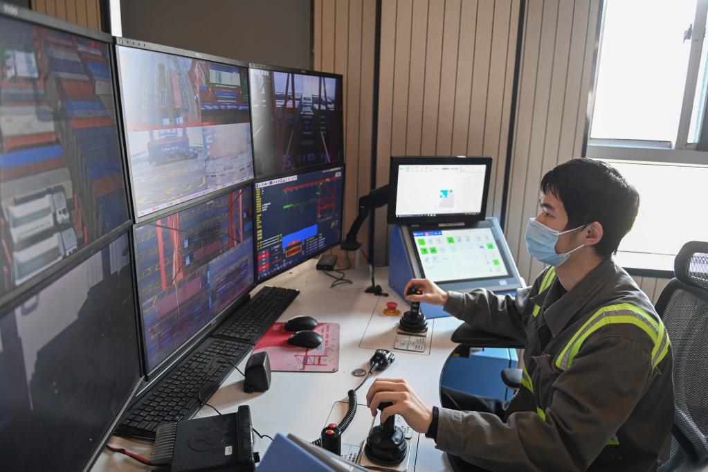 圖為寧波舟山港梅山港區(qū),橋吊司機在操作橋吊遠程控制系統。新華社記者黃宗治 攝