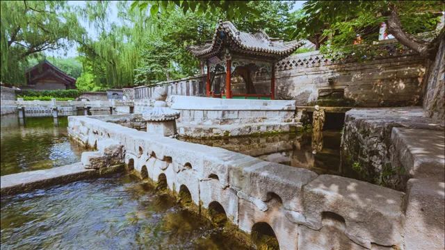 這首詩描寫的景致主要是“晉祠之水”。從詩中,我們可以發(fā)現(xiàn)晉祠之水有兩個特點(diǎn)。一是綠,因?yàn)樗袖仢M莎草,所以“晉祠之水如碧玉”。這景象如今前往晉祠還能看得見。二是水量充沛,能讓人“浮舟弄水”,而船上除了李白、元演,還有許多樂工歌伎,免不了還會有其他賓客,合理猜測,船定然不是一葉扁舟,起碼是游船不可。李白寫詩好夸張,形容晉祠之水為“百尺清潭”。然而他也說過“桃花潭水深千尺”,廬山瀑布“飛流直下三千尺”,說晉祠之水僅僅“百尺”,在李白詩中尚算保守。