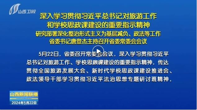 山西日報報道 5月22日,省委召開常委會會議,深入學習貫徹習近平總書記對旅游工作、學校思政課建設的重要指示精神,傳達貫徹全國旅游發(fā)展大會、新時代學校思政課建設推進會、政法領導干部學習貫徹習近平法治思想專題研討班精神,研究部署深化整治形式主義為基層減負工作。省委書記唐登杰主持會議。