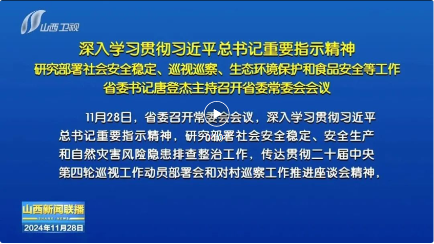 山西日報報道 11月28日,省委召開常委會會議,深入學習貫徹習近平總書記重要指示精神,研究部署社會安全穩(wěn)定、安全生產(chǎn)和自然災(zāi)害風險隱患排查整治工作,傳達貫徹二十屆中央第四輪巡視工作動員部署會和對村巡察工作推進座談會精神,聽取全省打好污染防治攻堅戰(zhàn)和加強食品安全監(jiān)管等情況匯報。省委書記唐登杰主持會議。