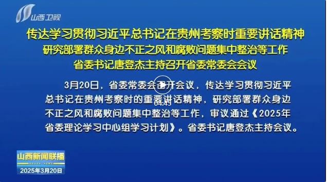 山西日報報道 3月20日,省委常委會召開會議,傳達學習貫徹習近平總書記在貴州考察時的重要講話精神,研究部署群眾身邊不正之風和腐敗問題集中整治等工作,審議通過《2025年省委理論學習中心組學習計劃》。省委書記唐登杰主持會議。