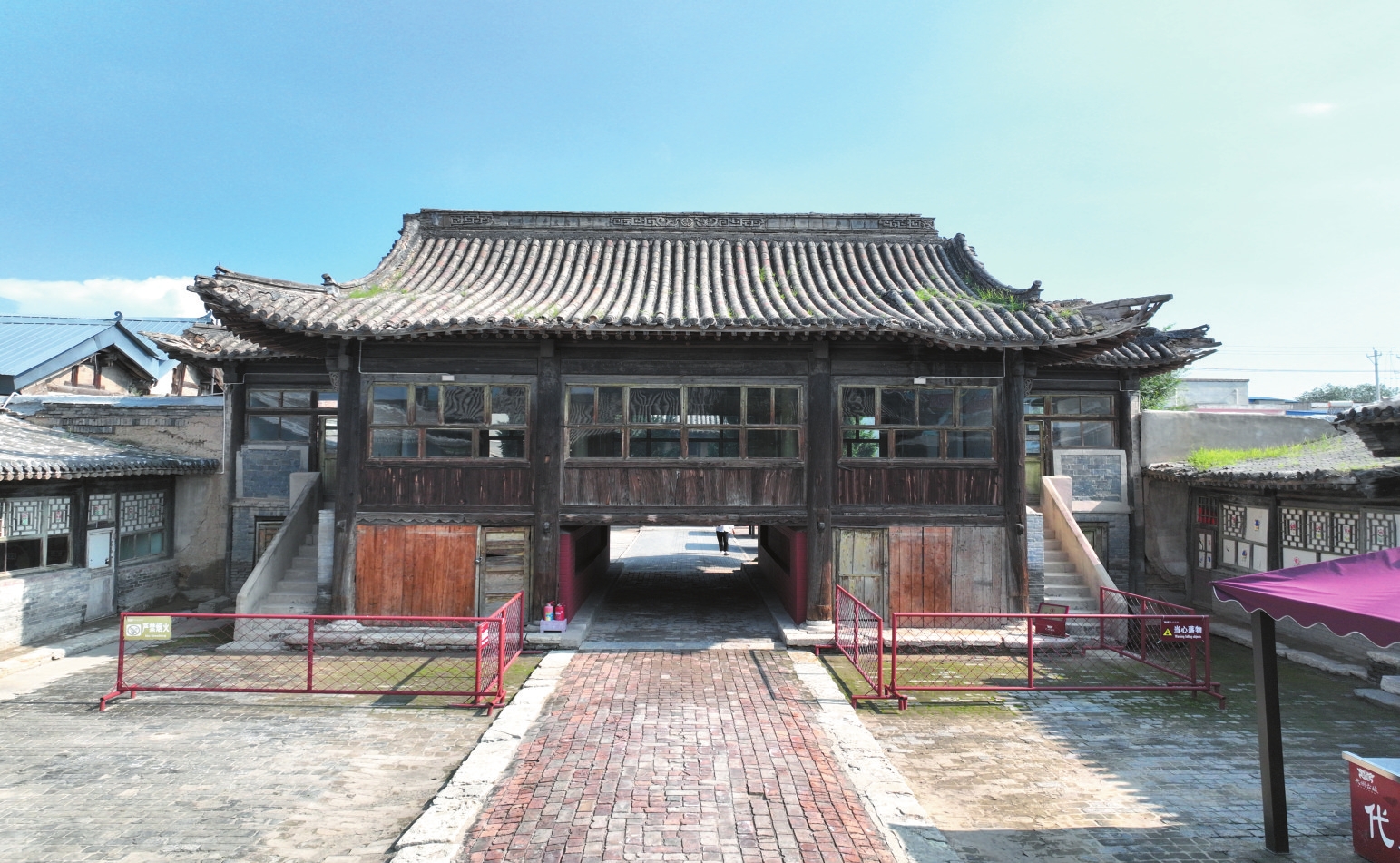 該廟坐北朝南,占地面積2564平方米,三進院落布局。中軸線上依次建有山門、戲臺、獻殿、正殿和后殿。兩側(cè)為東西配殿及耳殿。正殿與獻殿相連,屋頂呈勾連搭式,臺基共用。磚砌臺基,基寬19.4米、深15.4米、高0.7米。面寬五間,進深四椽。正殿單檐懸山頂,五檁無廊式構(gòu)架,獻殿單檐卷棚懸山頂,四檁卷棚式構(gòu)架。戲臺為磚砌臺基,基寬10.8米、深10.4米、高0.5米,為上下兩層磚木結(jié)構(gòu)。下層明間設(shè)通道,兩次間設(shè)封護墻;上層面寬三間,進深四椽,單檐歇山頂,兩側(cè)附半歇山式耳樓,前檐裝修已改。