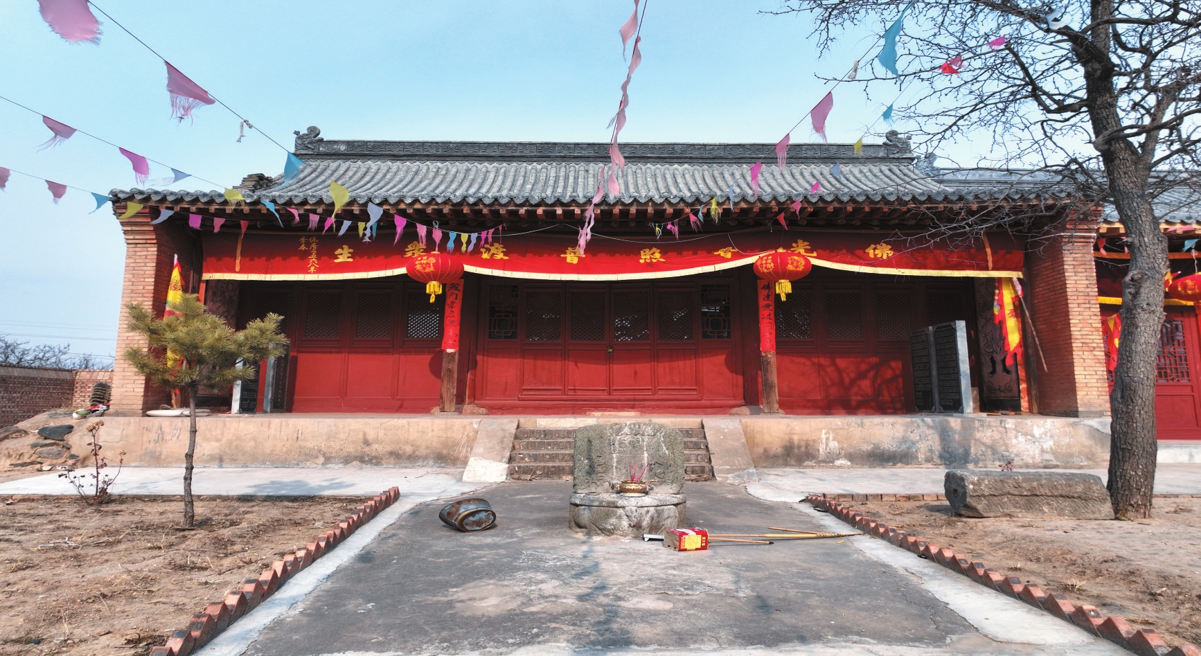嘉圣寺位于代縣棗林鎮(zhèn)顯旺村北,創(chuàng)建年代不詳。據(jù)過(guò)殿題記載,明正德十六年(1521)重修。該寺坐北朝南,占地面積3295平方米,三進(jìn)院落布局,中軸線上依次建有戲臺(tái)、過(guò)殿和正殿,兩側(cè)為東西配殿。過(guò)殿和正殿為明代建筑,其余皆為清代遺構(gòu)。過(guò)殿為石砌臺(tái)基,基寬11.2米、深9.3米、高1.3米,面寬三間,進(jìn)深四椽,單檐懸山頂,五檁無(wú)廊式構(gòu)架,裝修已毀。正殿為石砌臺(tái)基,基寬11.3米、深9米、高0.9米,面寬三間,進(jìn)深五椽,單檐硬山頂,六檁前廊式構(gòu)架,前檐明間和次間施四扇六抹格扇門(mén)。