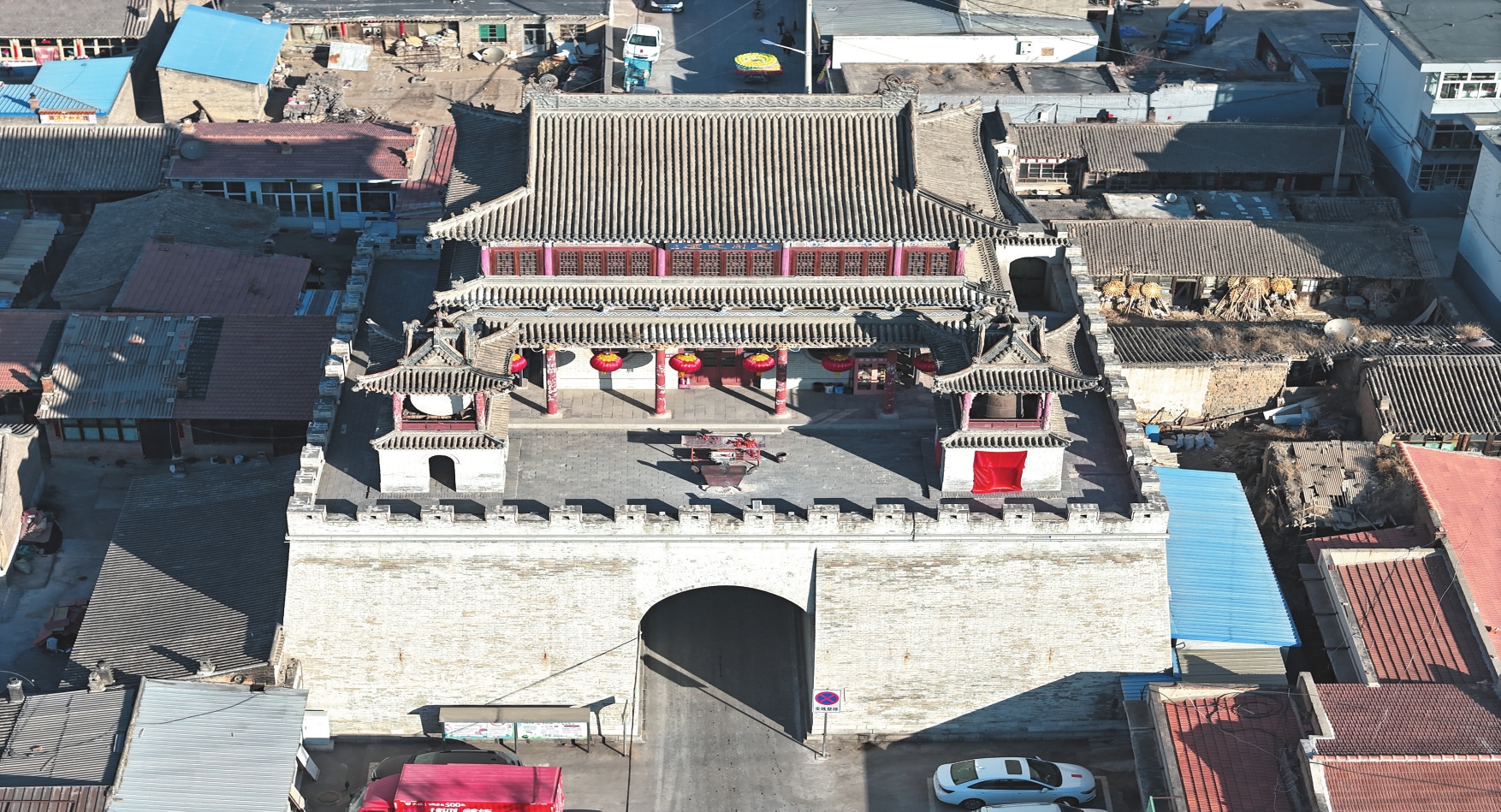 據(jù)重修鼓樓碑和《道光、光緒繁峙縣志》記載,該鼓樓始建于明代萬歷十四年(1586),清康熙二十七年(1688)維修,清乾隆二十三年(1758)增設鐘樓、鼓樓,光緒二年(1878)重修,現(xiàn)存建筑為明、清建筑。城臺呈方形,條石筑基,青磚鋪面,內(nèi)為夯土。臺基中設拱券門洞,南北貫通。城樓內(nèi)供奉文昌神,又稱為文昌閣,面寬五間,進深四椽,七檁前后廊構架,二層三檐歇山頂,上層斗拱一斗二升交麻葉,下層明間設拱券門,次間圓形窗,四角施通天柱,內(nèi)設樓梯,可登二層。