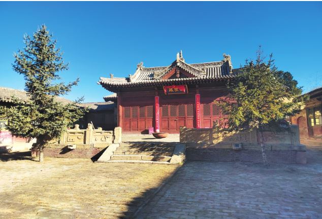 一進院布局,中軸線現(xiàn)存有正殿1棟,兩側(cè)建有配殿,西北角建有偏殿。正殿磚砌臺基,面寬五間,進深六椽,七檁前后廊式構(gòu)架,前檐斗拱為五踩,后檐為三踩斗拱,單檐懸山頂。前設(shè)月臺,建有抱廈三間,單檐歇山頂?,F(xiàn)新塑像3尊,正殿梁架有彩繪。