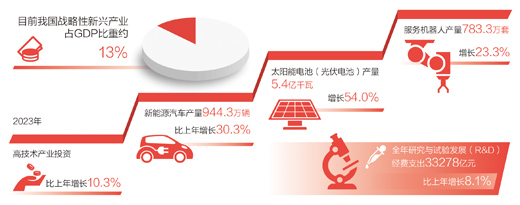 “發(fā)展新質(zhì)生產(chǎn)力,既有利于培育發(fā)展一批產(chǎn)業(yè)規(guī)模大、帶動能力強(qiáng)的支柱產(chǎn)業(yè),也有利于加快傳統(tǒng)產(chǎn)業(yè)轉(zhuǎn)型升級,增強(qiáng)我國經(jīng)濟(jì)發(fā)展韌性,推動經(jīng)濟(jì)實(shí)現(xiàn)質(zhì)的有效提升和量的合理增長?!敝猩酱髮W(xué)黨委副書記、校長高松代表說。2023年,我國高技術(shù)制造業(yè)增加值增長2.7%,高技術(shù)產(chǎn)業(yè)投資比上年增長10.3%,新動能不斷積蓄。