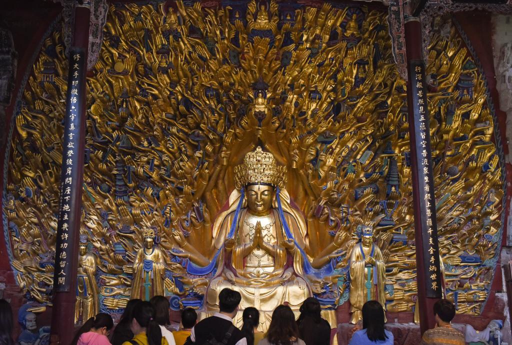 1952年,大足石刻文物保護(hù)機(jī)構(gòu)成立,開始系統(tǒng)科學(xué)保護(hù)大足石刻。當(dāng)年,北山石刻保護(hù)長(zhǎng)廊啟動(dòng)建設(shè),北山石刻上方加蓋了擋雨的頂棚;1961年,北山、寶頂山摩崖造像成為第一批全國重點(diǎn)文物保護(hù)單位;1999年,大足石刻被列入《世界遺產(chǎn)名錄》;2015年,全國石質(zhì)文物保護(hù)一號(hào)工程——大足石刻千手觀音造像搶救性保護(hù)工程竣工;2019年,《大足石刻全集》出版,填補(bǔ)了國內(nèi)石窟寺編寫出版大型考古報(bào)告的空白……