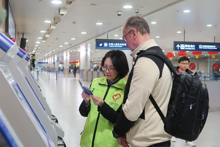 上海機(jī)場(chǎng)邊檢“百人外語志愿服務(wù)隊(duì)”民警正在協(xié)助外國旅客辦理入境手續(xù)。新華社記者唐斯琦 攝